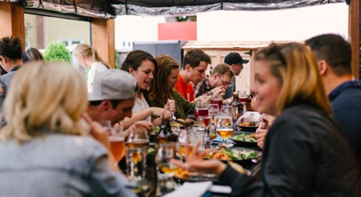 Man and Woman coworkers at a cafe wearing white shirts and name tags that read 'Mick' and 'Jen'